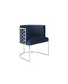 A bold statement piece designed to impress from every angle. Featuring plush blue velvet upholstery and a polished silver stainless steel frame, this accent chair stands out with its geometric honeycomb backrest detailing. Ideal for luxe lounges, living rooms, or stylish reception areas.