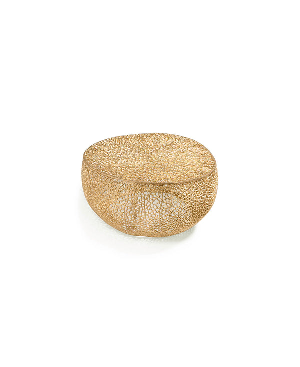 The Dolce Coffee Table is cast in solid aluminum and hand-finished by skilled artisans in India, giving each piece a one-of-a-kind character. Its intricate coral-like surface and organic silhouette add warmth, light, and sculptural energy to any interior.