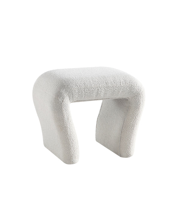 This ottoman is designed with a square-shaped cushioned top, providing a comfortable and supportive surface to sit on or rest your feet. The cushioning is typically plush and inviting, making it a cozy seating option or a convenient footrest after a long day. White Curved Boucle Ottoman.