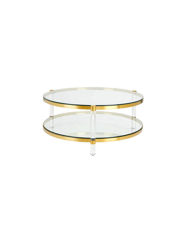 Bring softness and shine to your living space with this circular two-tier coffee table. Featuring brushed gold framing, transparent acrylic legs, and double glass shelving, it delivers both luxury and practicality with a light visual footprint.