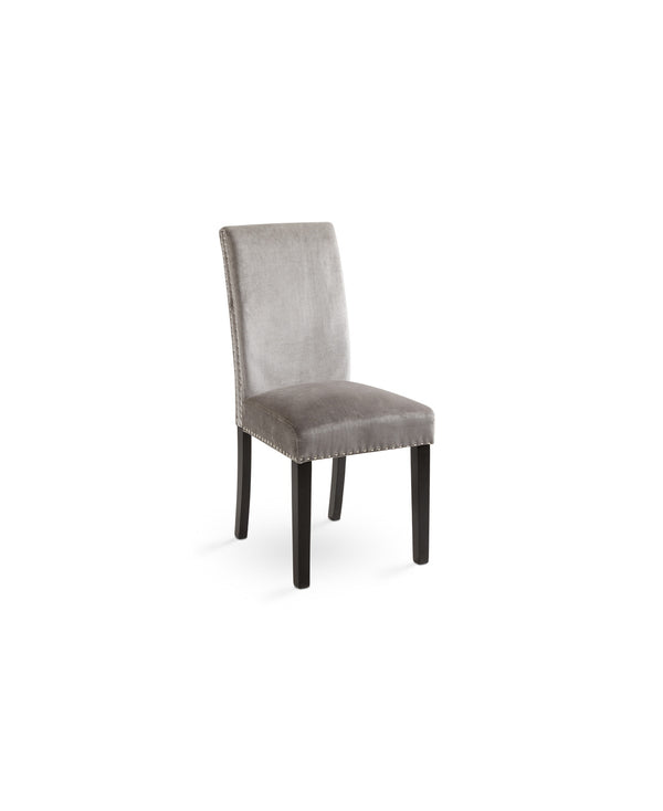 • High back grey velvet dining chair is accentuated with double row nail heads.