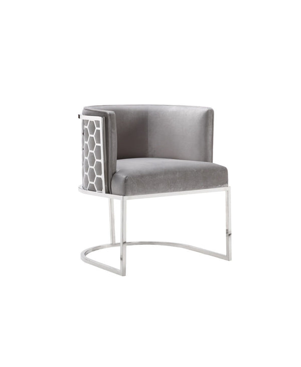 • Honeycomb laser cut metal detail on back and polished stainless steel legs